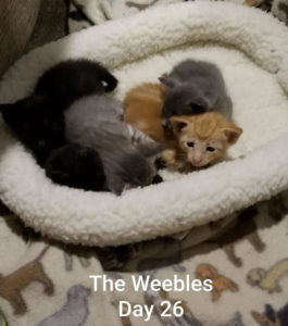 CLAIRE: The sweet little tortie kitten we found on a Bossier City street, gave birth to six kittens, on June 2nd. Sadly, one of the kittens died shortly after birth. The kittens are doing amazingly well. This is a lot for a young mom. We lovingly refer to the five babies as, The Weebles. We do not know how that name caught on, but it has stuck. Claire and the Weebles, have a wellness check with Dr. Daville, at Airline Animal Health and Surgery Clinic on July 2nd. Then we will begin them on a watered down canned, Royal Canin Mother and Baby Cat mousse. Once they begin on this food, it will take the stress off mom keeping up with nursing needs. The kitten sizes are quite varied, and it is a lot of fun to see their progress. Two kittens are already spoken for, so that makes us happy. Three we have named already.