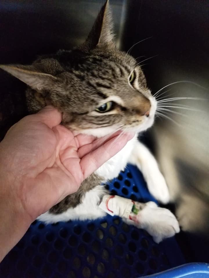 Sasha is the female, tabby, kitten that tested positive for leukemia, but we are hopeful she will retest negative in a few months. She is spayed now and is a very sweet girl. She is only about five or six months.