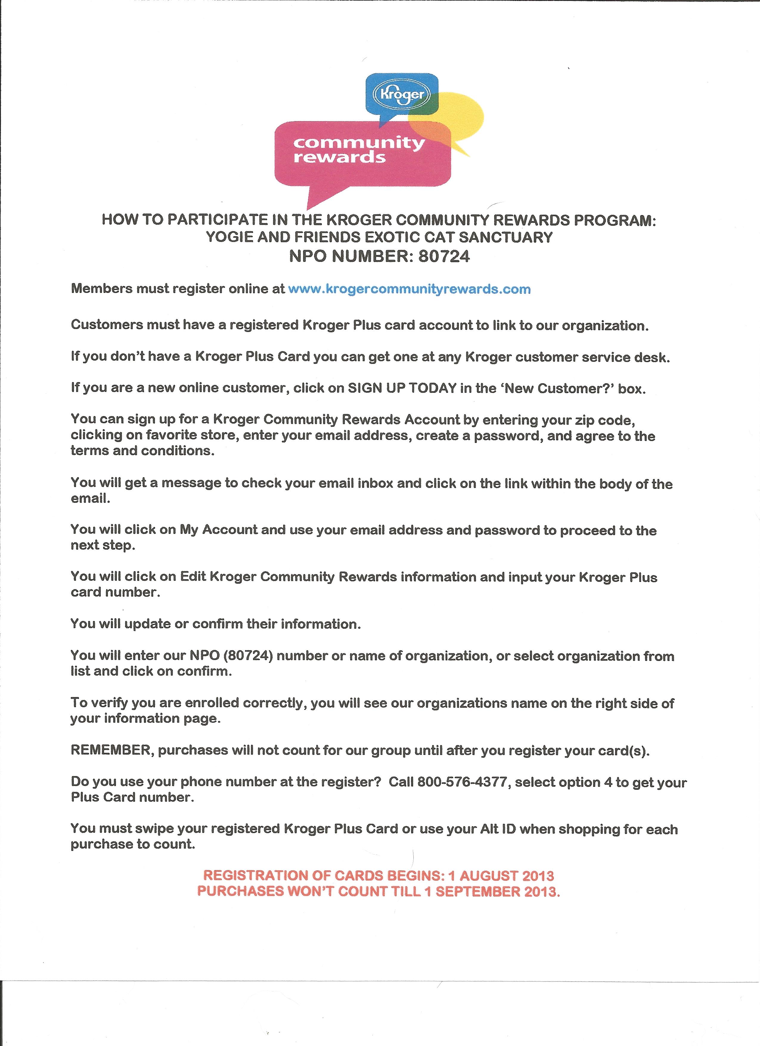 Kroger Community Rewards Program: Kroger has revamped their donation program and it is now called the Kroger Community Rewards Program. Our only concern here is that our fans who are not computer savvy or yet, don’t have one will have difficulty with this program. Hopefully there will be a friend, neighbor, or librarian that can assist them with this. The new program requires that you have a Kroger Plus Card (that’s not new), but it must be registered on-line if you haven’t already done that. Once you have your Plus Card registered you will link your charity of choice to your Kroger Plus Card. You cannot begin linking the card until 1 August 2013 and once it is done your purchases will start to count beginning 1 September 2013. We have a step by step instruction sheet to help you with this. We hope you will be patient and continue to work with this program. Once it is setup it will be a breeze, but we realize some of us are resistant to change. But that’s okay. We’ll get there. Lol! Download a copy of the instructions we have provided on our website.