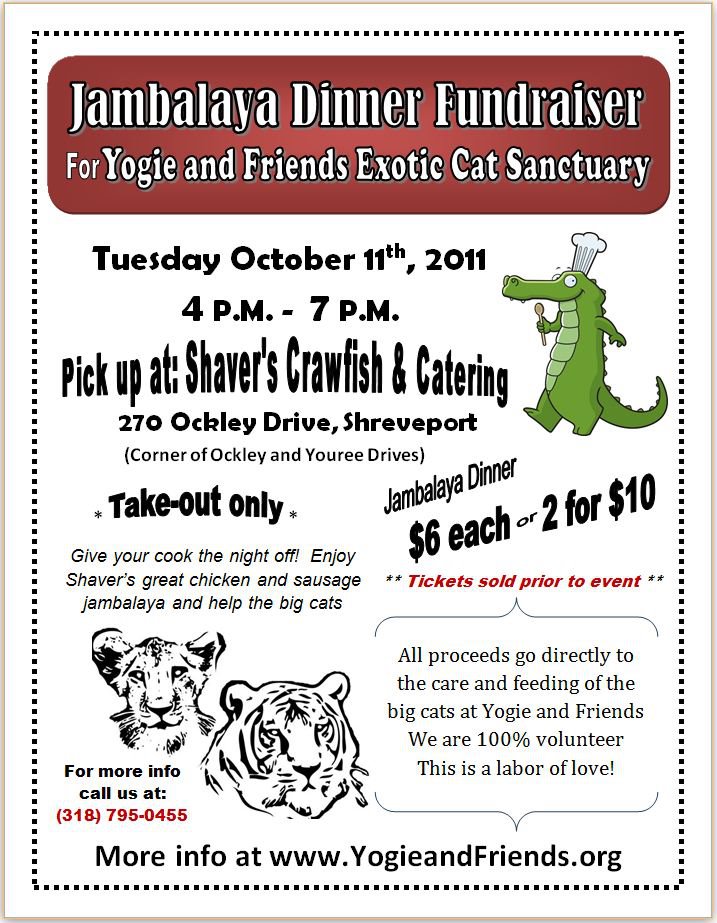 Jambalaya Fundraiser Take Out Dinner: Tickets are available now for our Jambalaya fundraiser take out dinner for October 11th. Tickets are $6 for one, $10 for two. You purchase the tickets in advance and pick up your meals at Shaver’s Crawfish and Catering 270 Ockley Drive in Shreveport between 4 and 7 p.m.