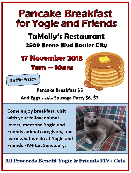 Donations of cash can be done in several ways, online via PayPal. You do not need a PayPal account to use a credit card to make a one-time donation via PayPal. Or you can mail a check or money order to: Yogie and Friends, 128 Fob Lane, Frierson, LA 71027